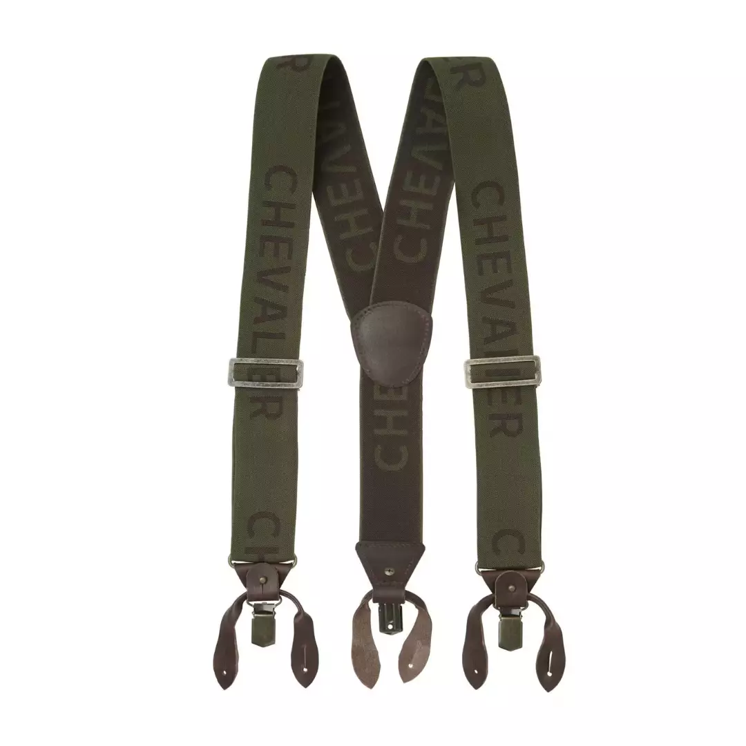 The Chevalier Logo Suspenders are wide and adjustable straps that securely attach to your trousers using durable metal clips or genuine leather button fasteners. Made from 70% polyester and 30% rubber, these suspenders provide excellent support and comfort. The set includes metal clips and three leather loops for the button attachments. As part of our commitment to sustainable development, the leather components are crafted from waste materials from previous production runs. The width is 50 mm with an adjustable length of 78-115 cm. The genuine leather button fasteners are approximately 4 cm in length.