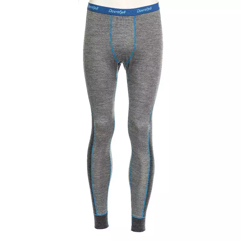 The Dovrefjell merino wool base layer comes in a soft melange grey color, accented with turquoise-blue stitching.