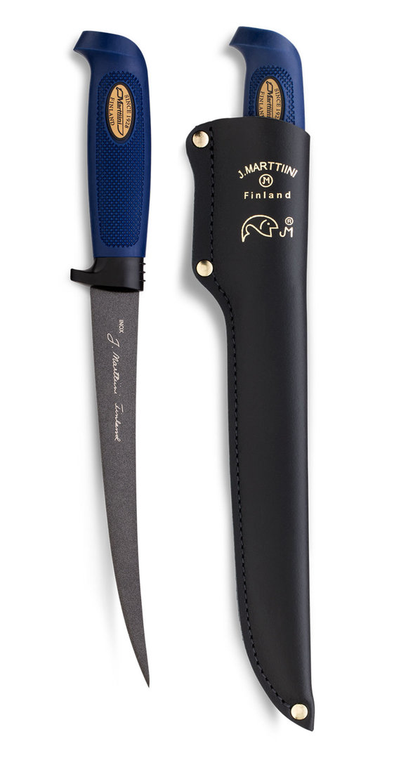 The blade is crafted from stainless chromium steel. The Martef coating repels dirt and moisture, drastically reducing friction for a smooth cutting experience. Thanks to this coating, the blade moves exceptionally easily through the material being cut. Cleaning the Martef-coated blade after use is extremely simple; just a quick rinse is sufficient. The textured rubber handle and finger protection bolster ensure a secure grip on the knife under all conditions. This blade length is best suited for filleting fish weighing around 2-3 kg. The knife is also an excellent tool for various other kitchen tasks. It comes with a black leather sheath.