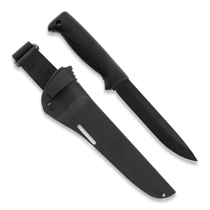 The Combat Knife M95 is designed to meet the demanding needs of law enforcement and military professionals, capable of performing under any conditions. The blade is made of high-quality carbon steel, ensuring durability for rigorous use. The handle is crafted from TPE plastic composite, providing a secure grip and resistance to wear and impacts. It features MOLLE compatibility and numerous carrying and attachment options.