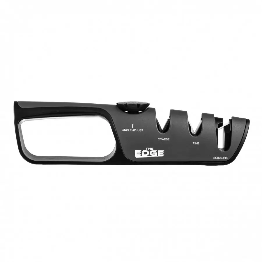 THE EDGE pointSHARP is the dream sharpener for every knife owner. It offers a smooth sharpening angle adjustment (14–24°) and three sharpening surfaces, allowing you to sharpen and hone kitchen knives, folding knives, hunting knives, and various household tools. THE EDGE pointSHARP is the perfect addition to any kitchen, enabling quick and precise sharpening of knives, scissors, and other cutting tools.