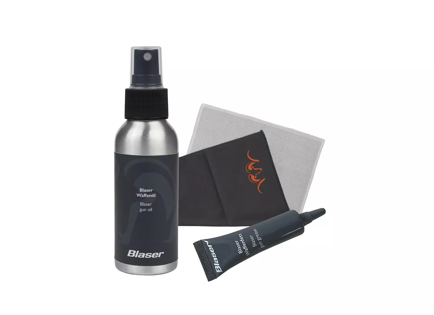 The Blaser Gun Care Kit includes everything you need for proper firearm maintenance. The package features Blaser gun oil, effective for removing dirt accumulated from shooting and providing protection against rust on your firearm's surfaces. Also included is Blaser gun grease and a cleaning cloth for optimal application of oil.