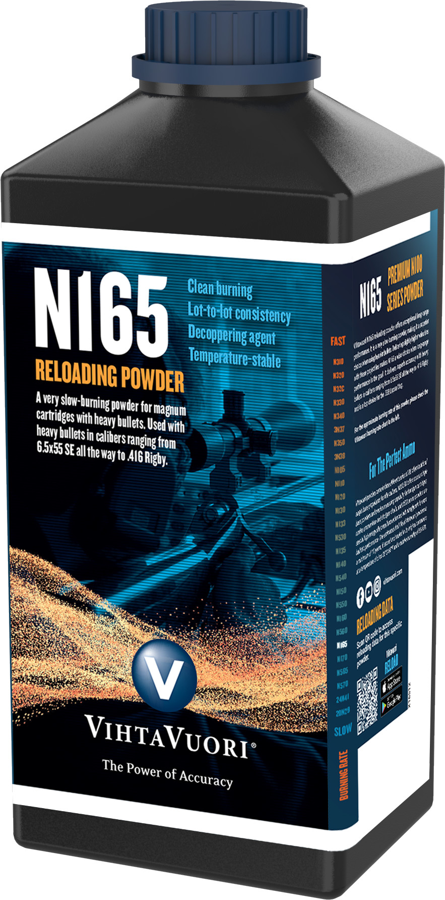 N165 is the ideal gunpowder for high-capacity heavy bullet magnum cartridges. Its application range extends from heavy .30-06 loads and upwards.
