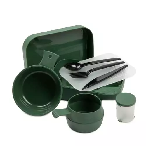 5Etta campingmatservis grön 5ettas perfekta matservis för camping, tältning och vandring. Egenskaper: 2 djupa tallrikar Kopp Kryddlåda Plastbestick; kniv, gaffel och sked Skärbräda / si sil... Läs mer