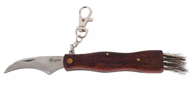 Praktisk svampkniv. Karbinhake, borste och litet, böjt blad som är utmärkt för rengöring av svampar, både i skogen och i köket!