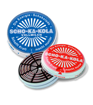Scho-Ka-Kola mjölk- och mörkchokladkombination, där mjölkchokladen är en mjukare version av den traditionella mörka chokladen berikad med koffein. Smaken av denna mörka choklad har inte döljts bakom överdriven sockerhalt, utan smaken är en äkta, stark mörk choklad. Den nostalgiska förpackningen är inte bara en reklamslogan, eftersom denna choklad har ätits ur metallburkar sedan förra århundradet. I den blå burken har lika mycket koffein laddats som i den röda, men smaken av mjölkchoklad är mjukare och sötare. Dock går det inte att jämföra med vanlig mjölkchoklad, eftersom smaken av koffein finns med, och chokladen är inte så överdrivet söt som vissa vanliga mjölkchoklader. Rekommenderas inte för barn, gravida eller koffeinkänsliga personer. Kan innehålla små mängder hasselnötter.