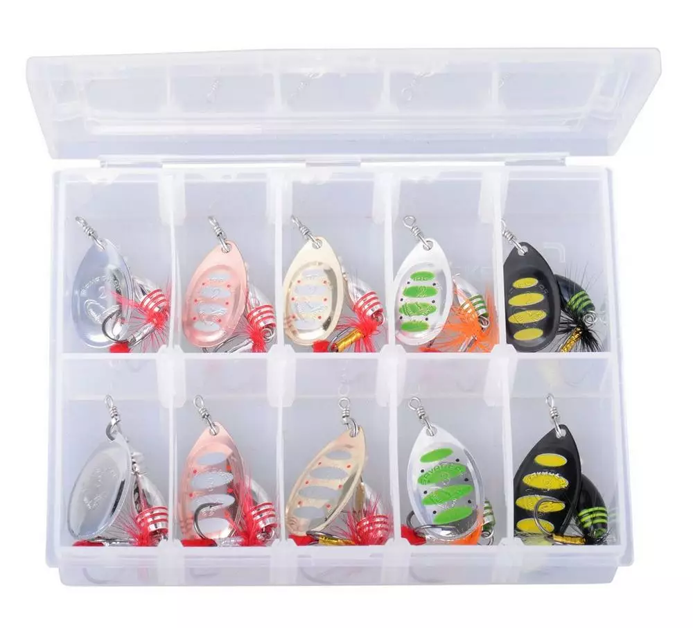 - Innehåller 10 olika spinnare i flera färger och vikter