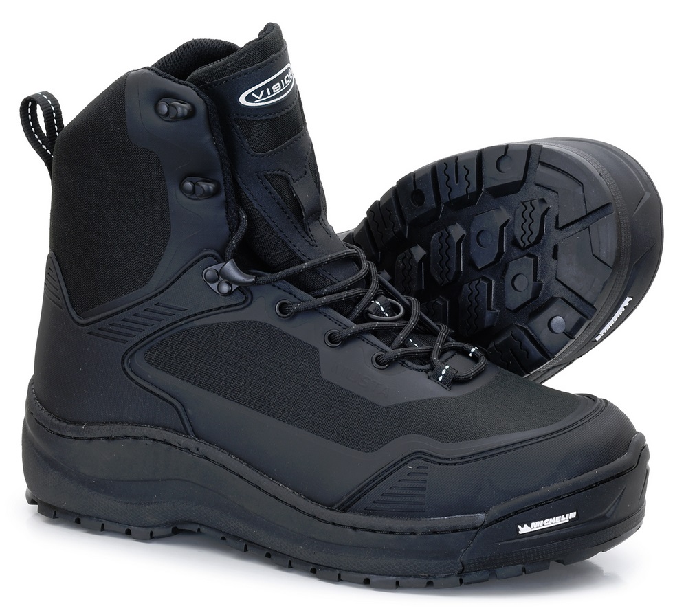 Vision Svart Michelin vadskor är moderna, lätta och av hög kvalitet. TPU-remsor i kritiska, slitevänliga områden (t.ex. ankeldel och tå) ökar hållbarheten. Den smarta designen gör att skon sitter perfekt utan att bli klumpig. Skons starka polyester-material är lätt även när det är blött och den infällda sömmen fastnar inte i risiga områden. Michelin-sulan, tillverkad av material från terräng- och vinterdäck, har länge bevisat sin greppförmåga under alla årstider och svåra förhållanden. Precis som med nya bil däck är materialet ganska mjukt och "klibbigt", vilket förhindrar att det blir för hårt och halt som många andra skomodeller/sulor.