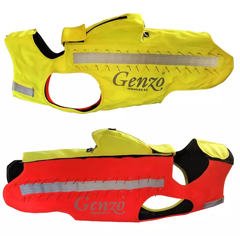 Genzo Wolf Varg skyddsvest med ingående vargtaggar. Med skyddsvesten skyddar du din hund när ni rör er i skogen och jagar. Vesten minskar risken för att vargar, vildsvin, vassa grenar eller taggtråd orsakar skador på din hund. Taggarna är lätta att sätta på och ta av från västen, vilket gör att den fungerar som en uppmärksamhetsväst i skogen. Den breda och fasta reflexbandet på sidorna erbjuder extra säkerhet genom att förbättra synligheten för övrig trafik. Vesten har också en GPS-ficka som passar de flesta på marknaden tillgängliga spårningsenheter samt en förstärkt D-ring för spårningslina. UHMWPE är ett helt nytt material som västen är tillverkad av. Det har alla Kevlars styrkor, men har utvecklats vidare. Detta gör det till ett optimalt material för hundars skyddsvästar som utsätts för både stötar och snitt.